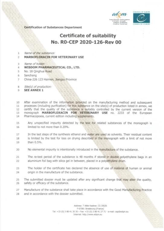 2021年9月21日,江苏米兰官方站网页版-米兰MiLan(中国)药业有限公司通过EDQM的技术审批,获马波沙星CEP证书。